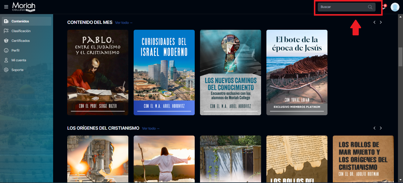 ❗ La forma más sencilla de encontrar un curso, si conoces el nombre del mismo, es en el espacio superior derecho donde dice “buscar”.