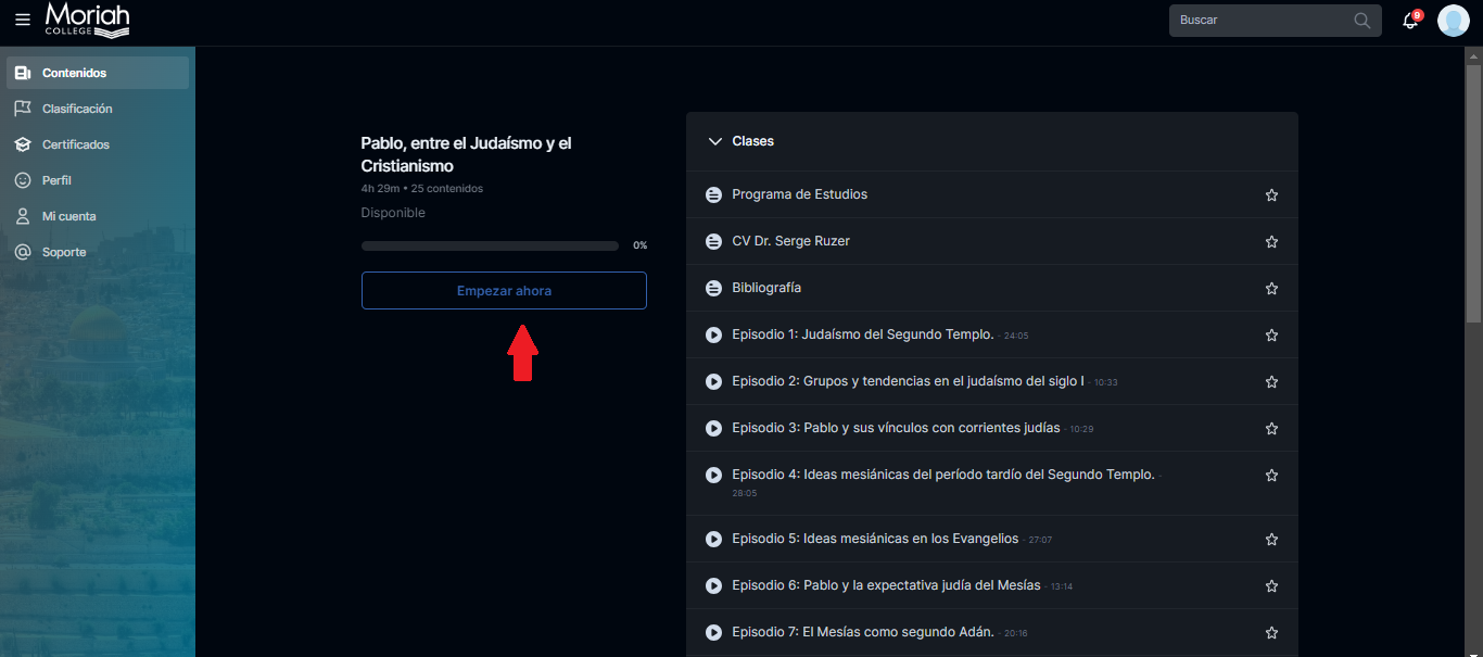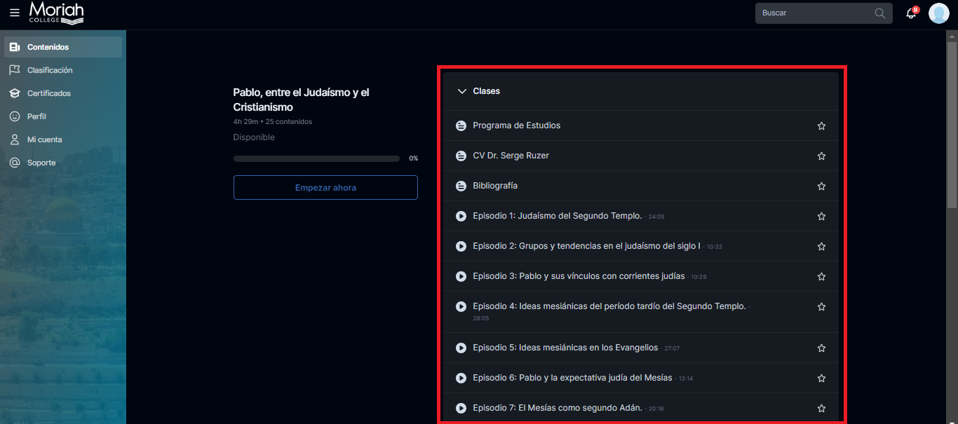 Al ingresar encontrarás un listado del lado derecho, allí verás todo el contenido que incluye el curso: programa de estudios, CV del profesor, bibliografía, clases/ episodios, encuesta de satisfacción y una explicación de cómo descargar el certificado.