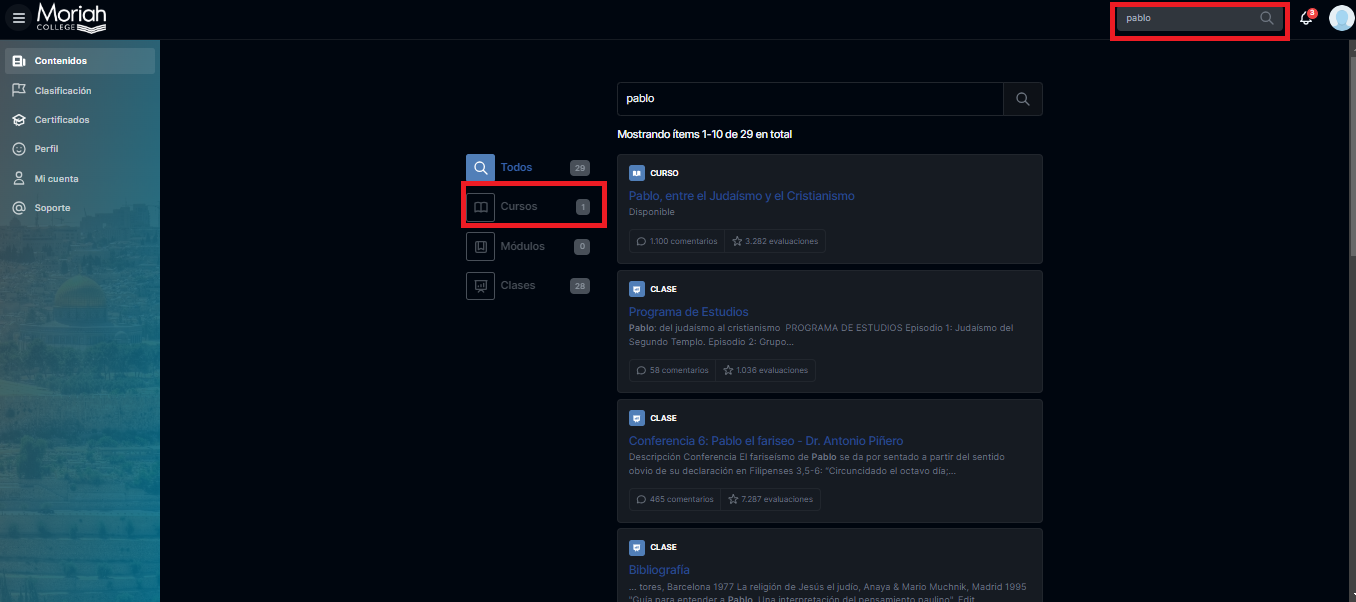 Una vez realizada la búsqueda, encontrarás el curso o temas relacionados a ello.