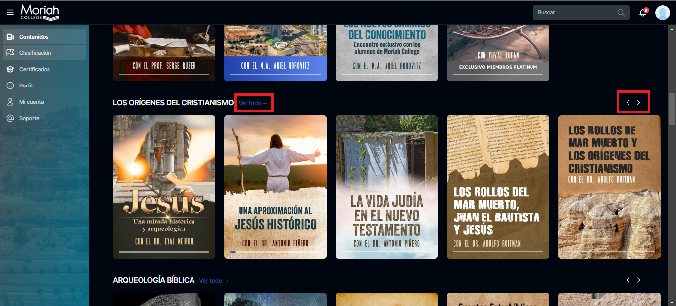 Para ver los cursos incluidos en cada categoría, busca la categoría deseada, allí puedes presionar en las flechas posicionadas en la parte derecha, o bien, en donde dice "Ver todo".