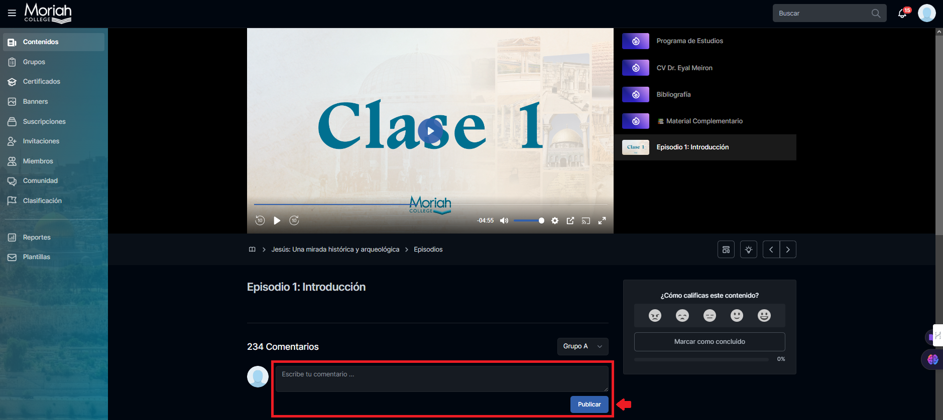 Una vez que ingresaste en tu curso de interés, podrás encontrar en la parte inferior (Recuadro en color rojo) el espacio para realizar tu comentario.